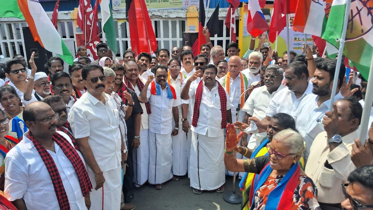 Leaders of INDIA bloc on Tuesday held a demonstration near Anna Salai to protest against the conduct of Special Intensive Revision (SIR) in the Union Territory.