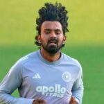 A man looks out from a balcony following an Israeli military strike targeting a residential building in the Haret Hreik neighbourhood, of Beirut’s southern suburbs on November 23, 2025. Israel’s military said on November 23, 2025, that it had carried out a strike on a senior member of the Iran-backed Hezbollah militant group in Lebanon’s capital.