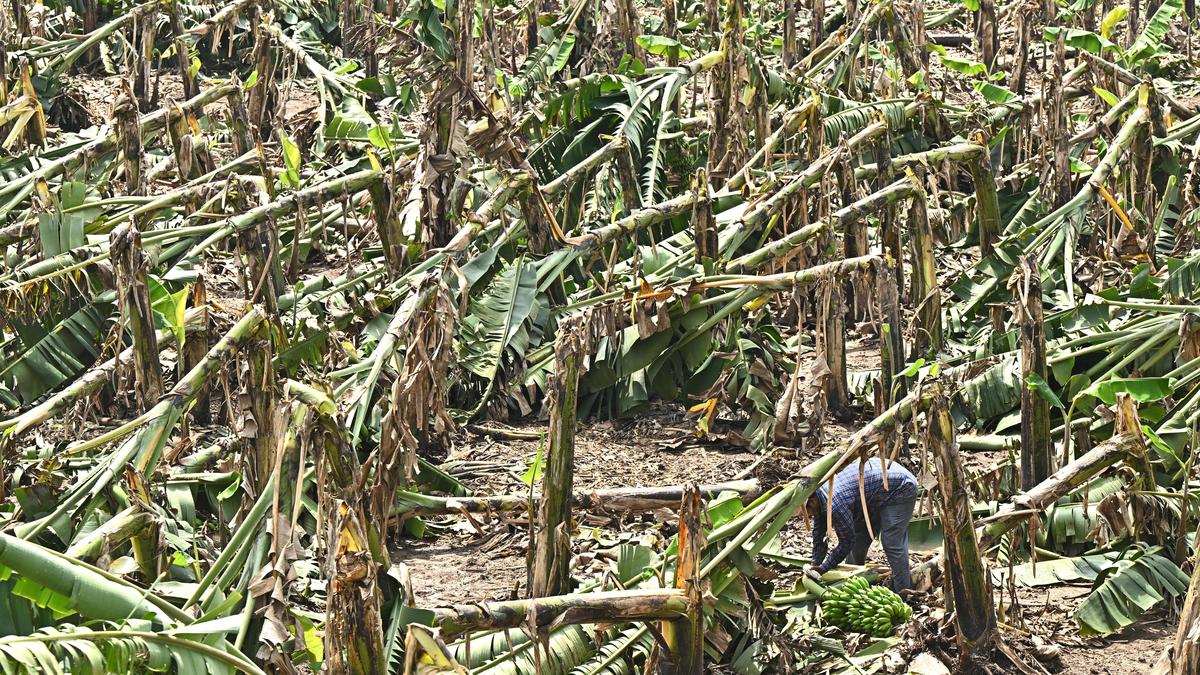 A farmer walks out of his banana orchard flattened by strong winds and heavy rain under cyclone Montha, at Undavalli in Guntur district.
