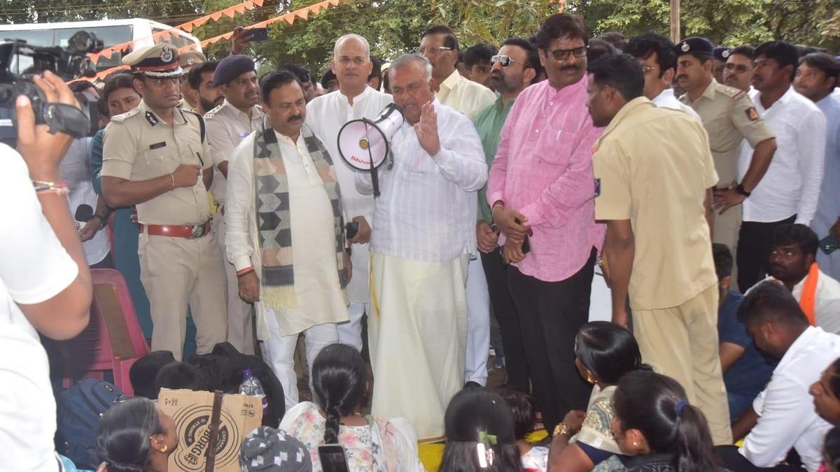 Transport Minister Ramalinga Reddy speaking to job aspirants who staged a protest in Hubballi on Friday.