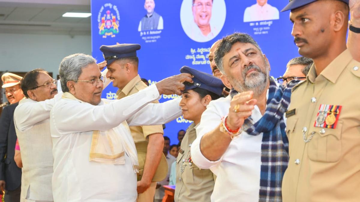 CM Siddaramaiah, DCM D.K. Shivakumar and Home Minister G. Parameshwara put the new, redesigned peak caps on police personnel.