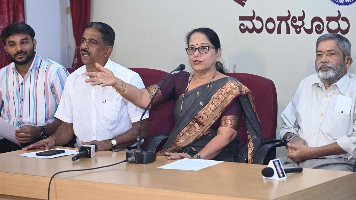 Bhoo Maalikara Horata Samiti President Mariyamma Thomas speaking to reporters in Mangaluru on Friday.