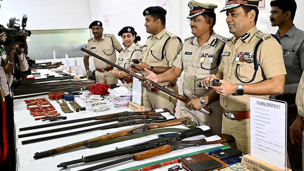 Andhra Pradesh ADGP-Intelligence Mahesh Chandra Laddha, Eluru Range Inspector-General G.V.G. Ashok Kumar and other police officers in Vijayawada inspect weapons seized from the arrested Maoists.