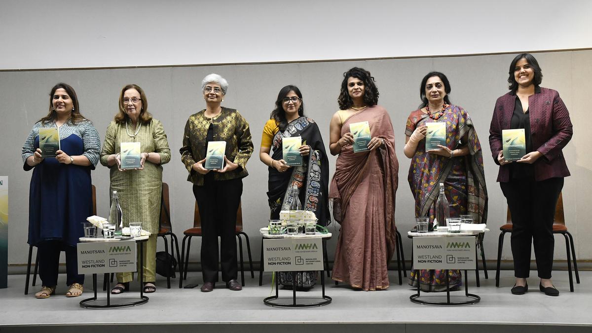 (From Left to Right) Aparna Piramal, Pheroza Godrej, Kavita Arora, Sidrah Naiyer, Poornima Vishwanathan, Nandini Murali, and Neha Kirpal during the launch of the book Homecoming: Mental Health Journeys of Resilience, Healing, and Wholeness  at the Bengaluru International Centre in Bengaluru on Friday.