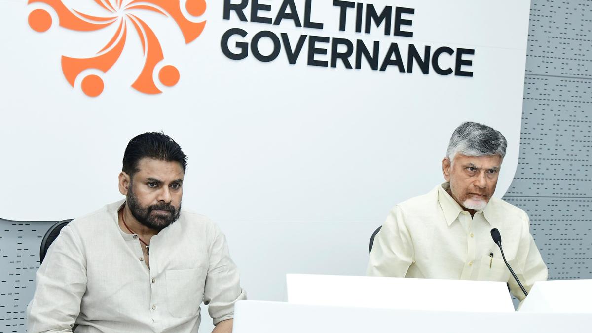 Andhra Pradesh CM Chandrababu Naidu holds a review meeting on cyclone Montha at the Secretariat on October 28, 2025. Deputy Chief Minister K. Pawan Kalyan is also seen. Photo: Special Arrangement