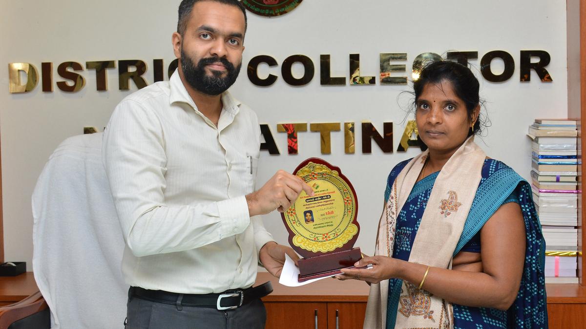 Collector P. Akash. felicitates Booth Level Officer R. Baby in Nagapattinam on Wednesday.
