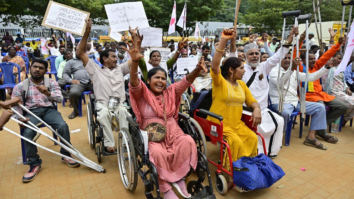 A file photo of members of the Karnataka State Disabled and Caregivers’ Federation demanding increase of monthly pension to ₹10,000, and along with various other benefits, in Bengaluru on October 8, 2025.