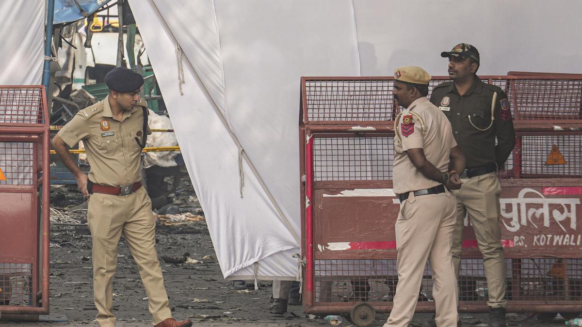 Police personnel at the cordoned off area in view of the blast that occurred near Red Fort Metro Station on Monday, killing 13 people and gutting several vehicles, in New Delhi, Tuesday, Nov. 11, 2025