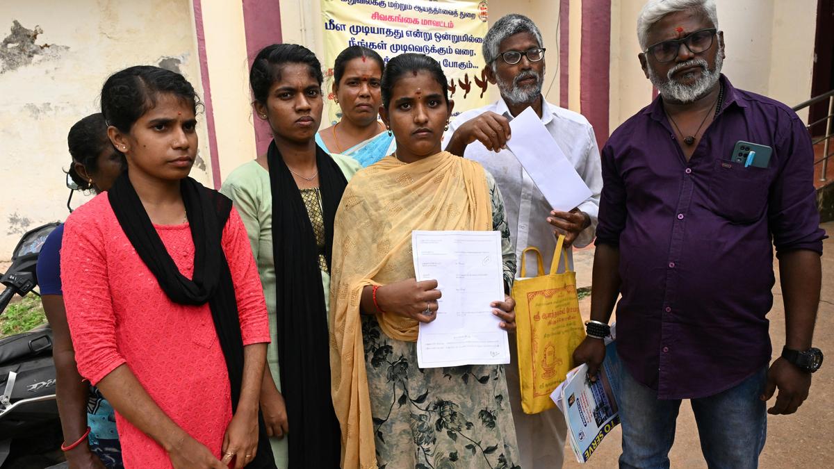 Former students of nursing college in Manamadurai demand degree certificates at grievance meeting in Sivaganga on Monday.