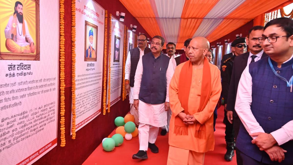 Uttar Pradesh Chief Minister Yogi Adiyanath and Union Minister for Education Dharmendra Pradhan view an exhibition that is a part of the ‘Kashi Tamil Sangamam’ in Varanasi on Tuesday. Photo: Special Arrangement