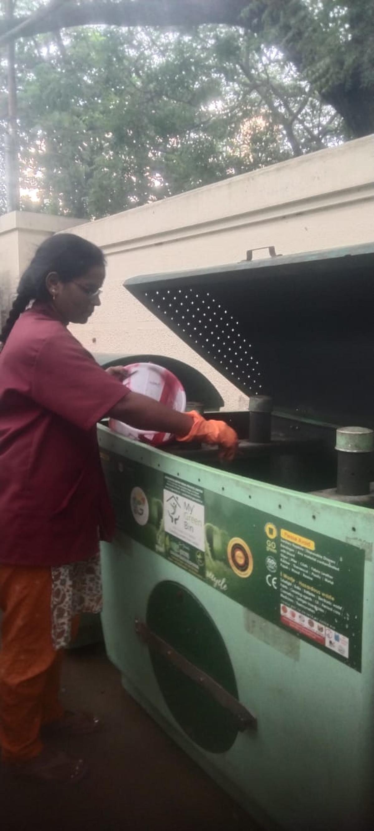 After carrying out a study of apartments in Adyar where composting was adopted, two 800-litre My Green Bins were bought to the community. From flyers to messages on the WhatApp group, segregation of waste was emphasised strongly. The housekeeping team was trained on steps they needed to take once waste was collected.