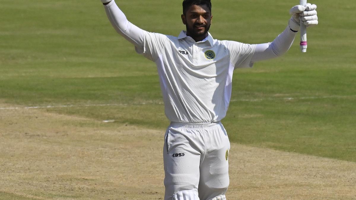Hyderabad’s Rahul Radesh celebrates after scoring a century during the Ranji Trophy Elite match against Rajasthan at the Rajiv Gandhi International Stadium in Uppal on Sunday.