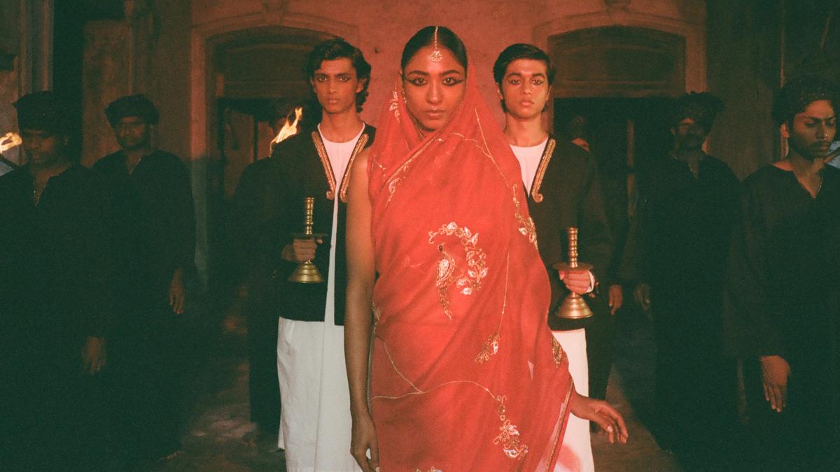 The campaign shot by Ashish Shah, a Raw Mango loyalist, unfolds in a surreal, dreamlike sequence: a model decked in red and flanked by expressionless men looks unflinchingly at the camera; another wrapped like a mummy in gold brocade wears an ornate hat topped with a handcrafted bird; a woman balances predatorily over a man; and a sightless horse is held aloft in boats lit by flaming torches.