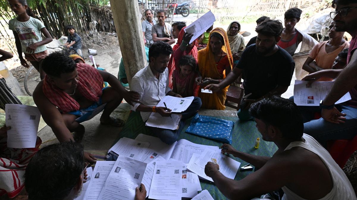 A Booth Level Officer (BLO) checks documents during Special Investigation Revision to electoral roll Drive at Kamalpur Village under Jalalgarh Block in Purnia district in Bihar.