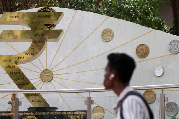 A man walks past an installation of the Rupee logo and Indian currency coins outside…
