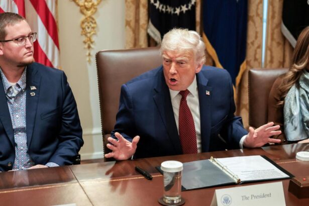 U.S. President Donald Trump gestures next to farmer Cordt Holub and Meryl Kennedy of the…