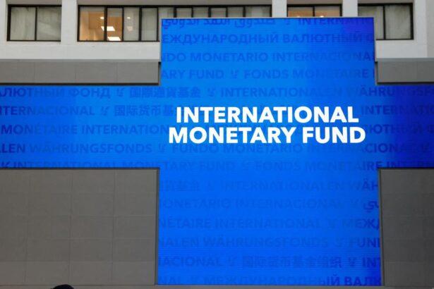 The International Monetary Fund logo is seen outside the headquarters building in Washington. Image used…