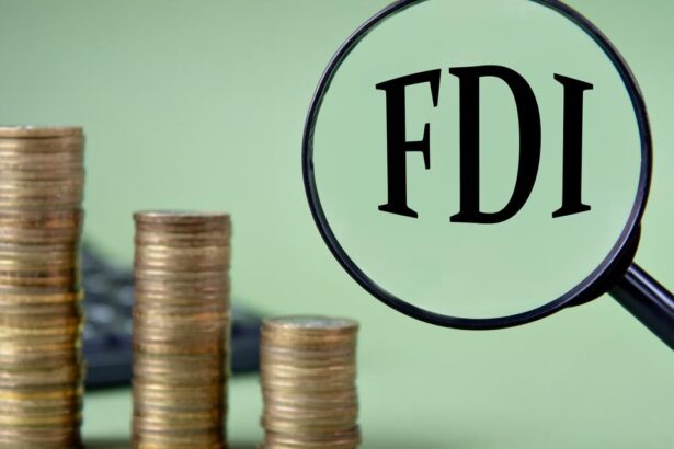 Magnifying glass with the letters FDI on the background of stacks of coins. Business concept…