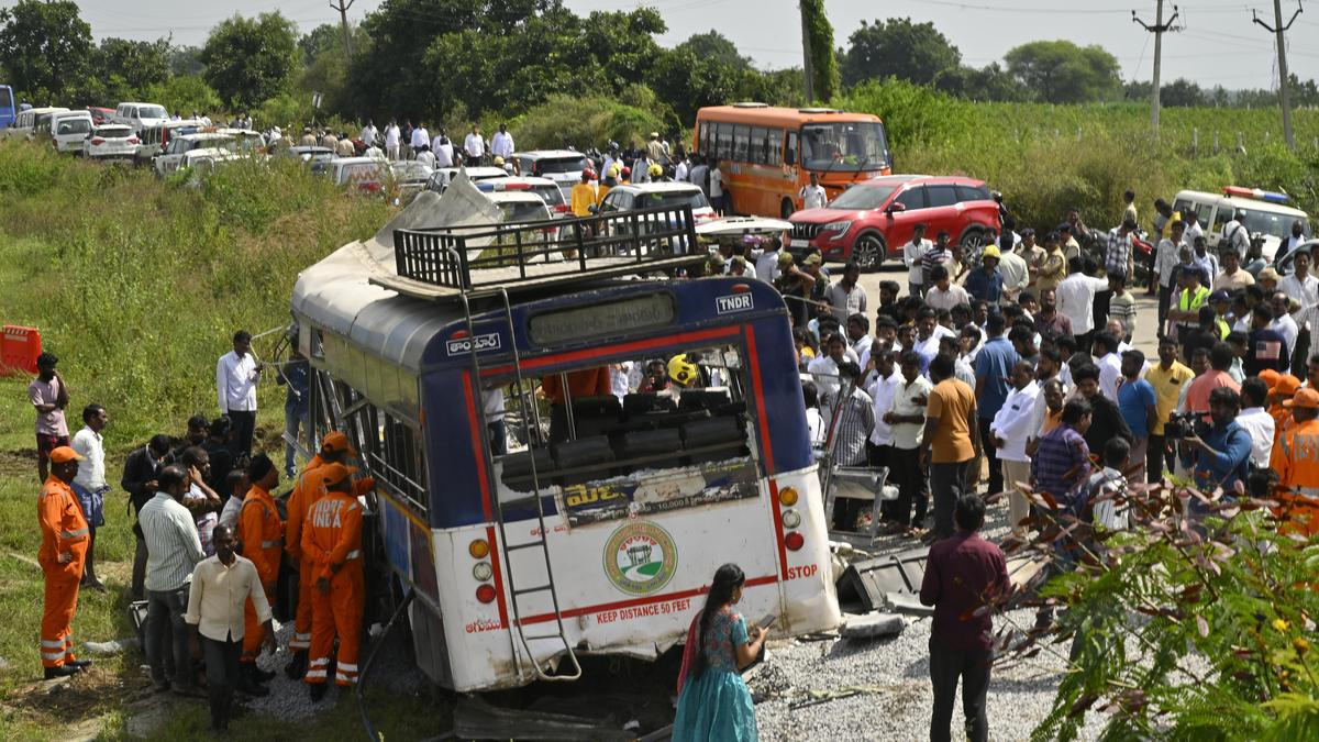 Police and firefighters at the site after a tipper lorry carrying gravel collided with a Telangana State Road Transport Corporation (TGSRTC) bus, in Chevella, Mandal, Rangareddy district on Monday (November 3, 2025)