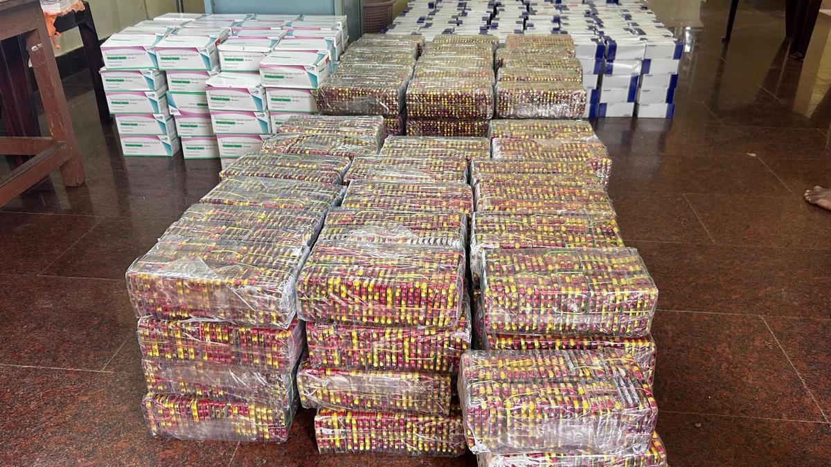 Medicines seized by Thoothukudi Q branch police at Veerapandiyapattinam in Thoothukudi district.