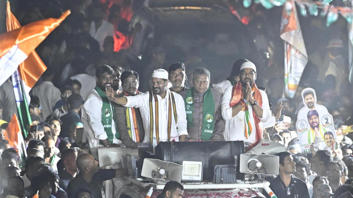 Telangana Chief Minister A. Revanth Reddy at a roadshow with the Congress party’s candidate Naveen Yadav ahead of the upcoming Jubilee Hills bypoll, in Hyderabad on Wednesday.