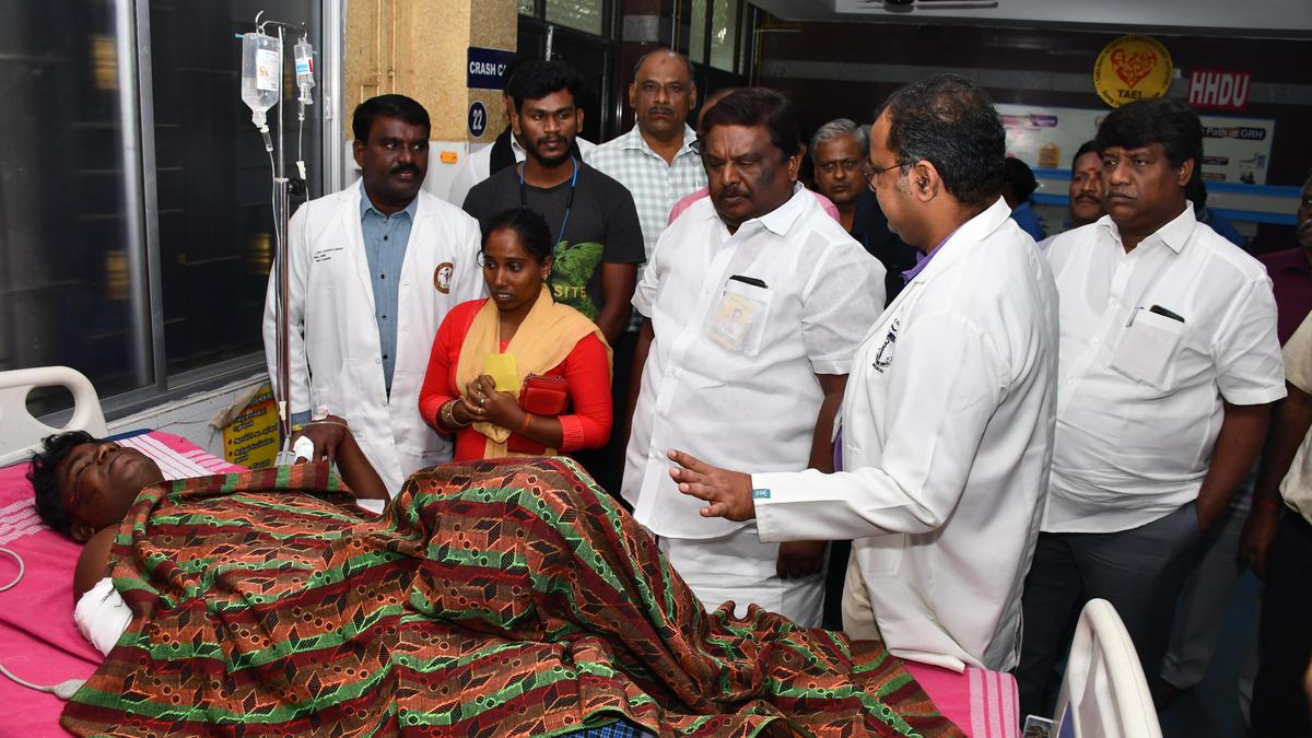 Transport Minister S.S. Sivasankar visiting the injured passengers at the Government Rajaji Hospital in Madurai on Monday (December 1, 2025).