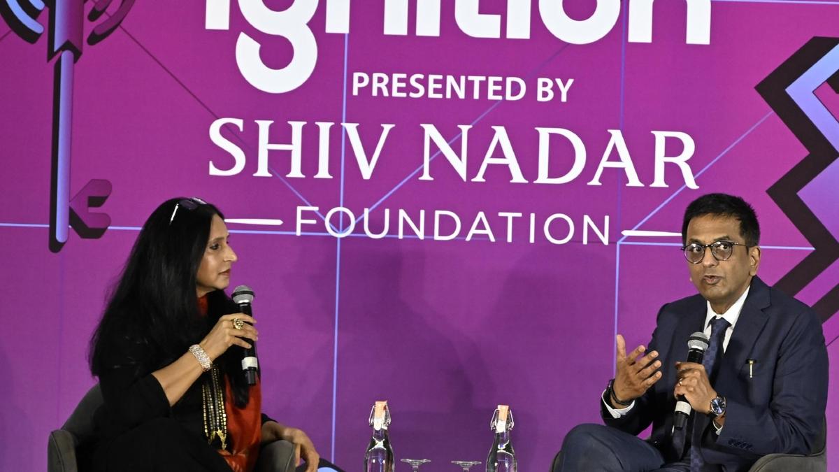 Former Chief Justice of India D.Y. Chandrachud in conversation with Shoma Chaudhury, journalist, at a function organised by Shiv Nadar Foundation on Thursday