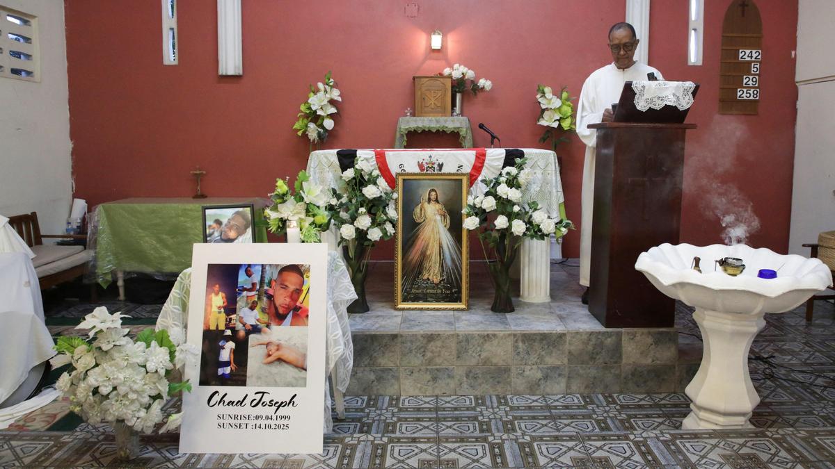 A priest conducts Mass during a memorial held by family members of Chad Joseph, whose family believe he was killed in a U.S. military strike on a boat in the Caribbean, at Saint Michael’s Roman Catholic Church in Las Cuevas, Trinidad and Tobago, on October 22, 2025.