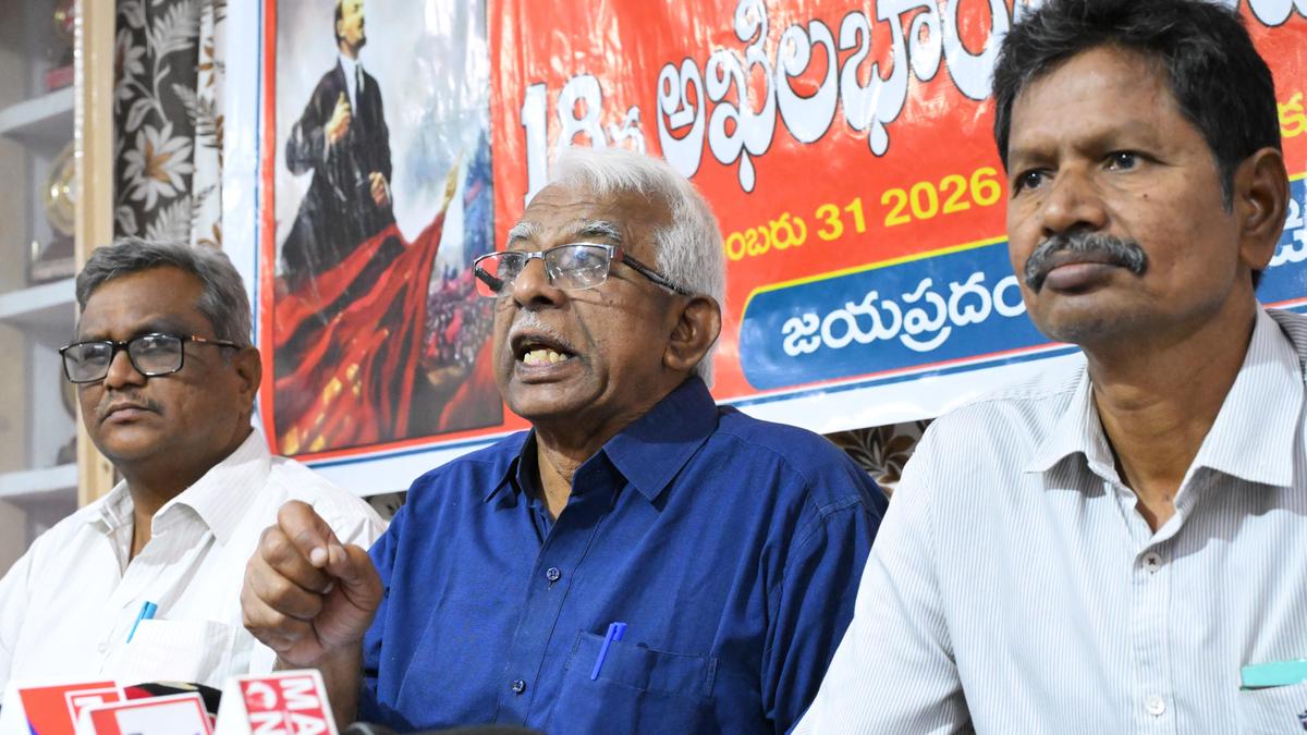 CITU State general secretary Ch. Narasinga Rao addressing a media conference on Vizag steel in Visakhapatnam on Monday.