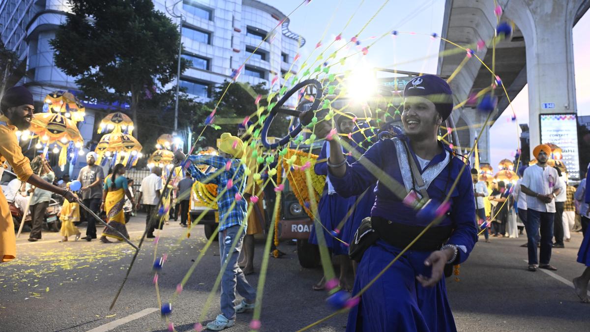 Bright yellow light palanquins, resembling illuminated umbrellas, led the procession. The shimmering lights, beating of drums, and rhythmic chants created a festive and spiritual atmosphere. Along the route, volunteers distributed water bottles, snacks and langar (food) from trolleys and goods vehicles that moved as part of the procession. Devotees and passers-by joined in, seeking blessings as the procession wound its way through the heart of Secunderabad.