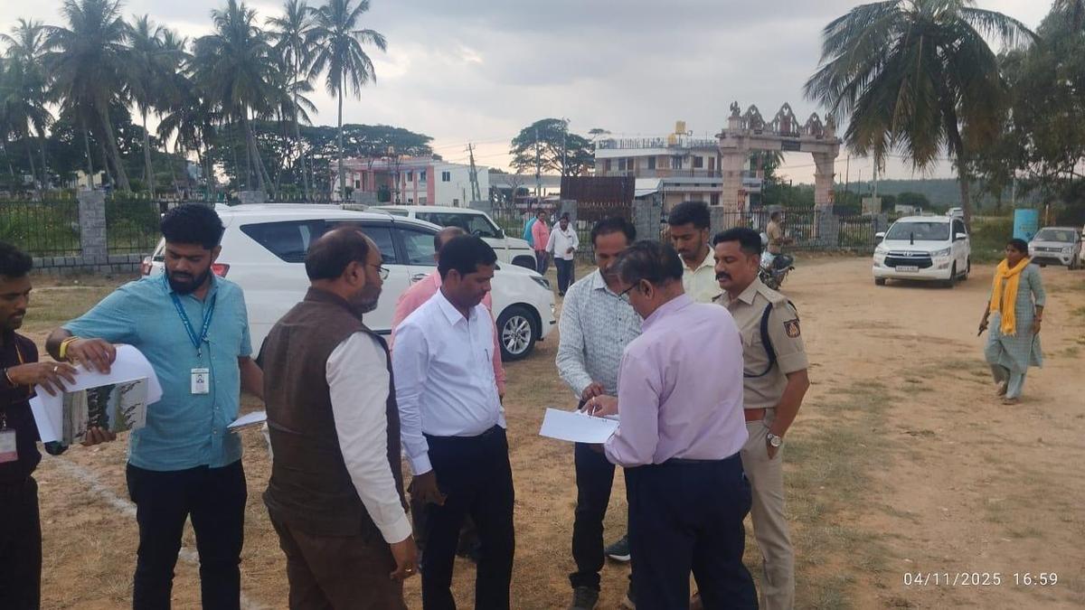 Deputy Commissioner Kumar inspecting the site of Vice-President C.P. Radhakrishnan’s scheduled visit at Melkote in Mandya district.