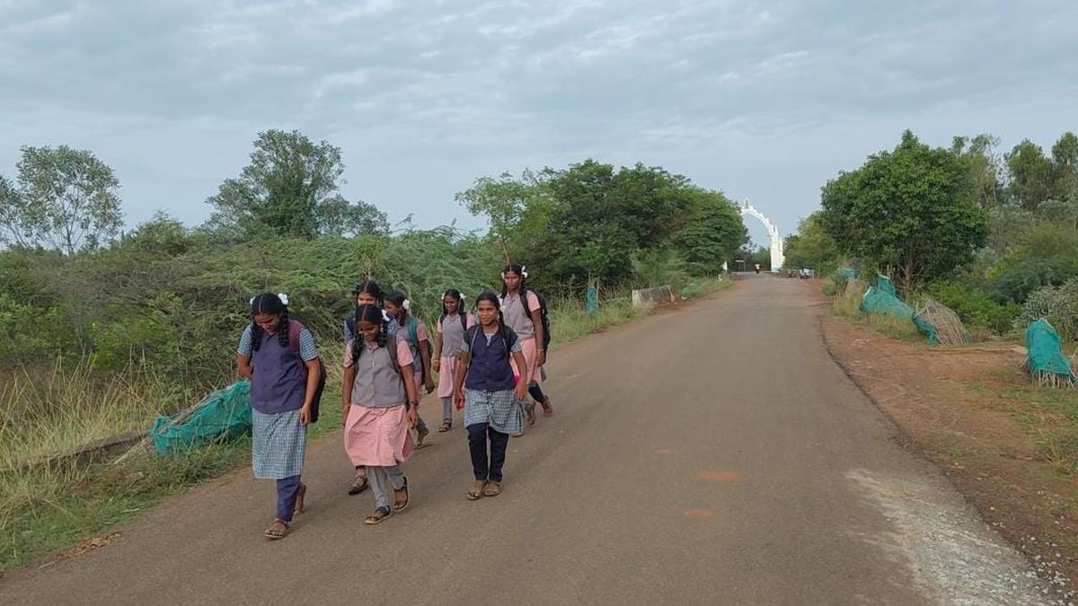 Schoolchildren from Manganur panchayat in Pudukkottai walk an unlit 4 km stretch from the village arch to their homes.