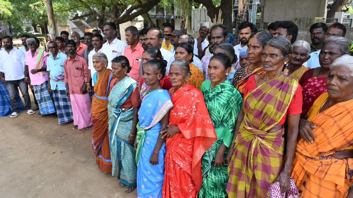 Residents of Gandheeswaram Pudhur who came to submit a petition at Tirunelveli Collectorate on Monday.