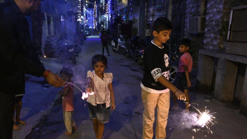 Children bursting firecrackers ahead of Deepavali in New Delhi on Saturday. | Photo Credit: SHIV…