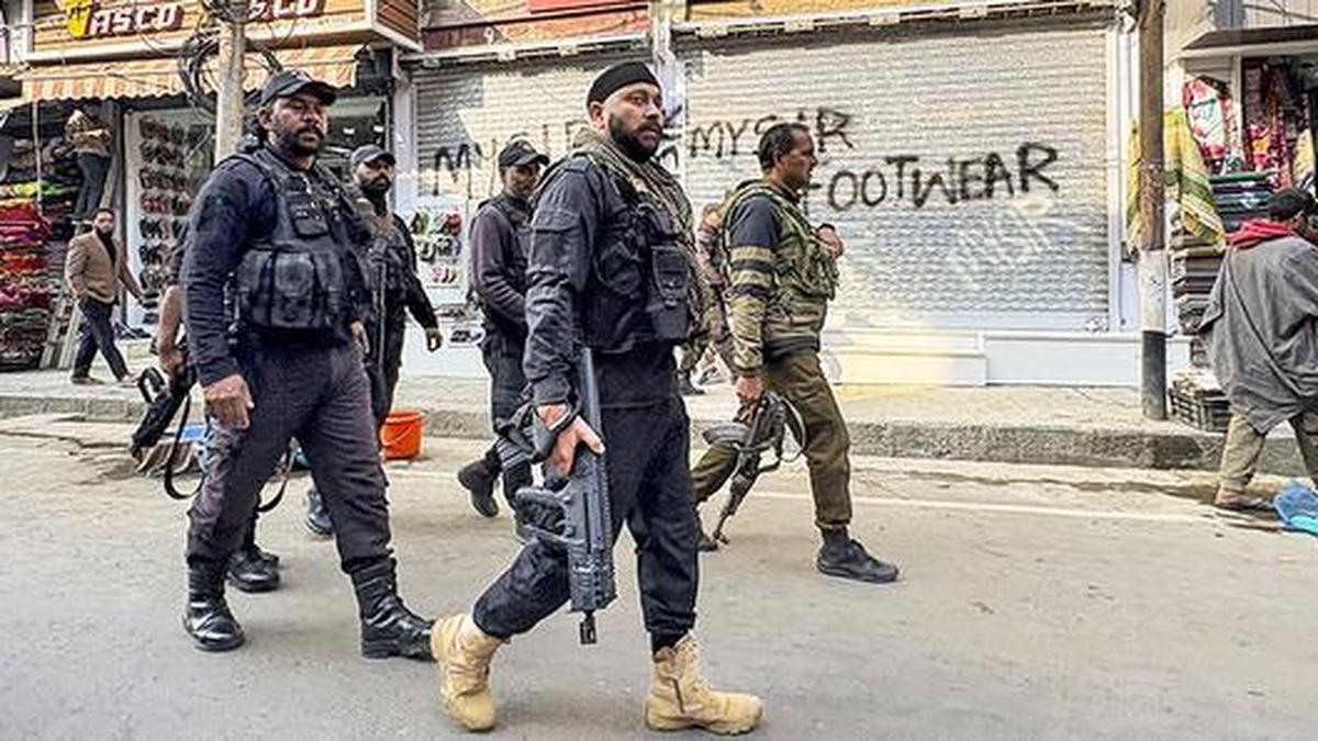 Security personnel stand guard following the arrest of Dr. Adeel (a resident of Wanpora, Kulgam), accused in an interstate and transnational terror module, in Anantnag, on November 10, 2025.