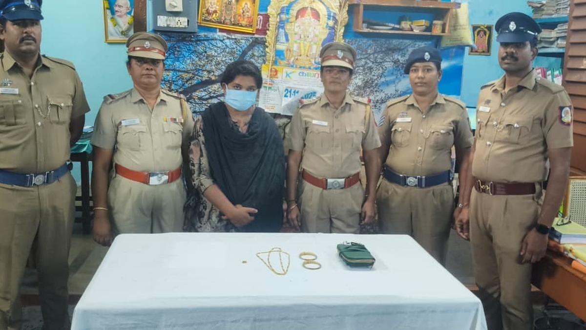 A 45-year-old woman was arrested by Government Railway Police (GRP) on Saturday for stealing 13 sovereigns of gold jewellery from a commuter at Katpadi railway station in Vellore.
